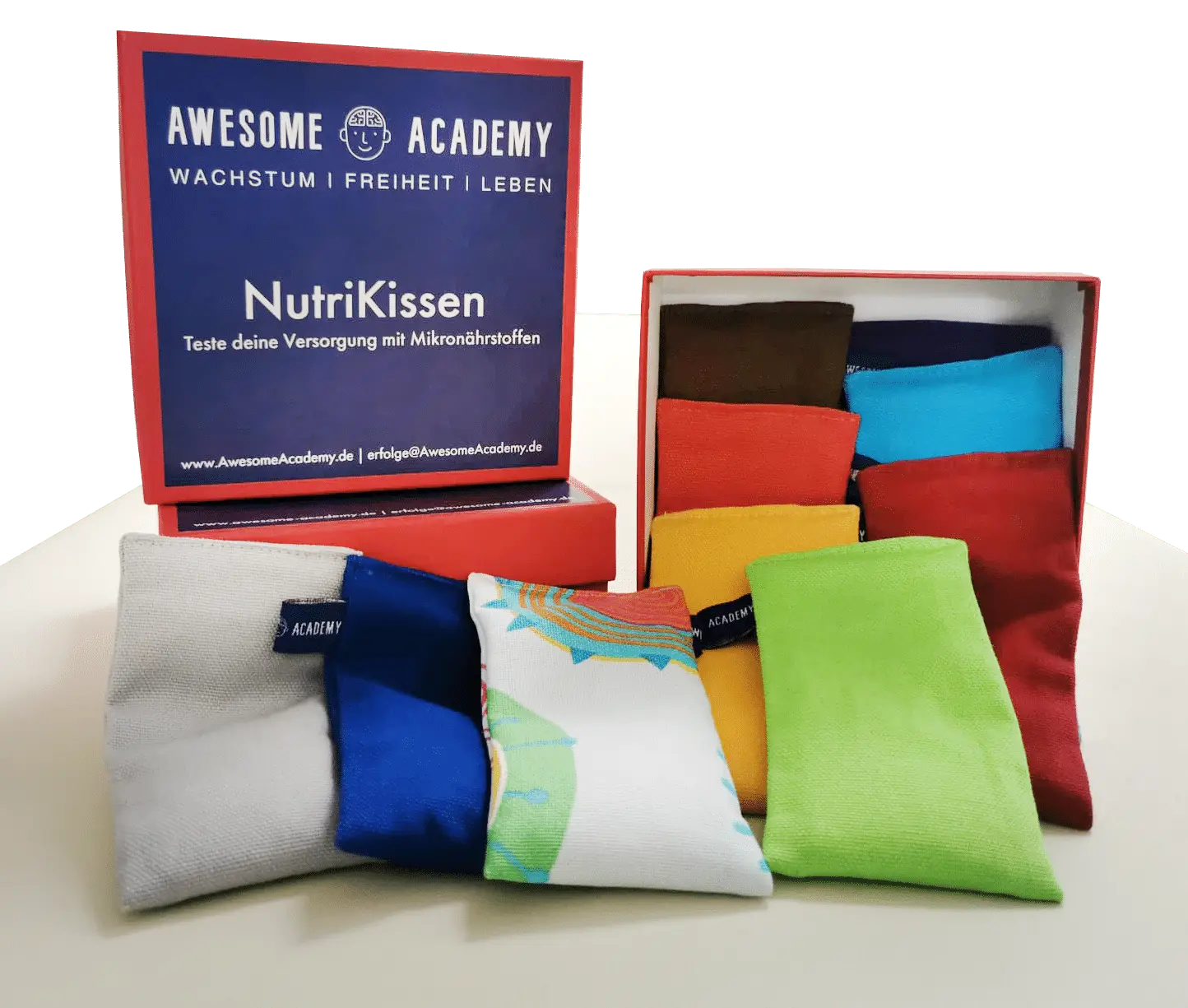 Die unterschiedlichen Farben der Kissen stehen jeweils für einen bestimmten Mikronährstoff. Zusätzlich enthält die Box zwei bunte Kissen, die eine optimale Supplementdosierung ermöglichen.